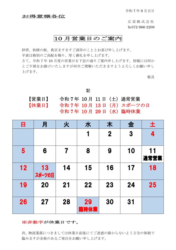 2025.09.25 【営業案内】10月 営業日のご案内 【休業日】 10月13日(月)スポーツの日 10月29日(水)臨時休業 【営業日】 10月11日(土)通常営業 お客様には何かとご不便をお掛け致しますが、ご理解のほどよろしくお願いいたします。