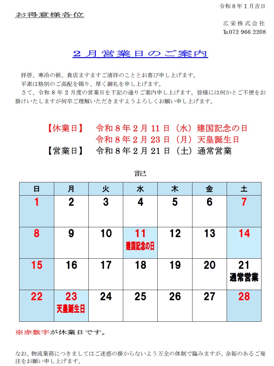 2026.01.22 【営業案内】2月 営業日のご案内 【休業日】 2月 11日(水)建国記念の日 2月 23日(月)天皇誕生日 【営業日】 2月 21日(土)通常営業 お客様には何かとご不便をお掛け致しますが、ご理解のほどよろしくお願いいたします。
