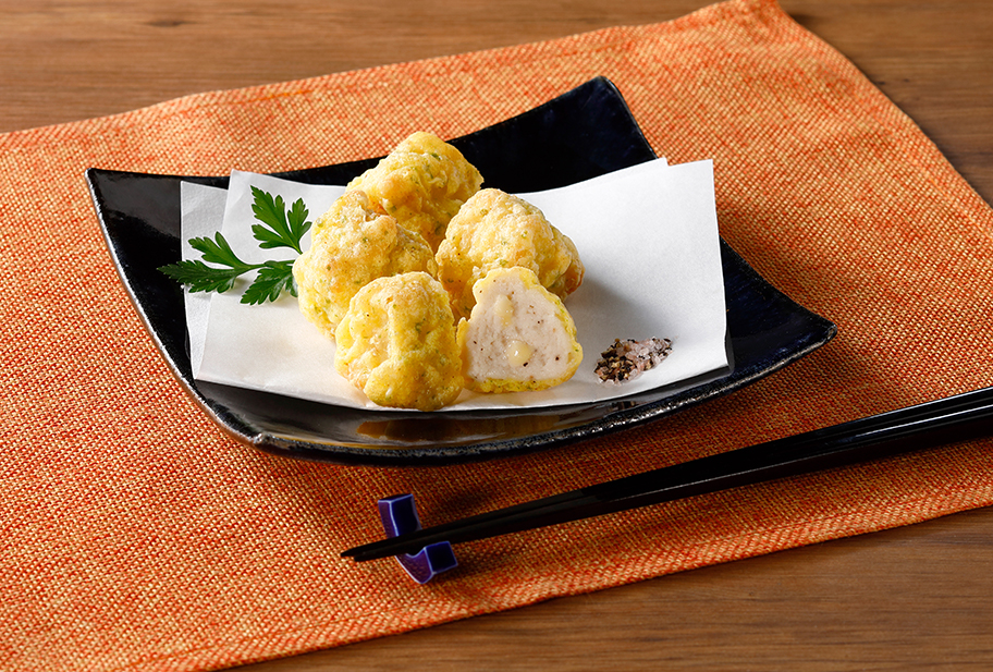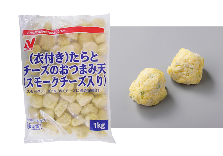 2025.10.21 ニチレイたらとチーズのおつまみ天1㎏袋 2025年冬商材特集 香ばしいチーズとふんわりすり身の相性抜群!冷凍庫からすぐ使える、時短&高クオリティな一品です。 たらのすり身に香り豊かなスモークチーズを加えた一口サイズの天ぷらです。衣付き商品なので、揚げるだけの簡単調理です。