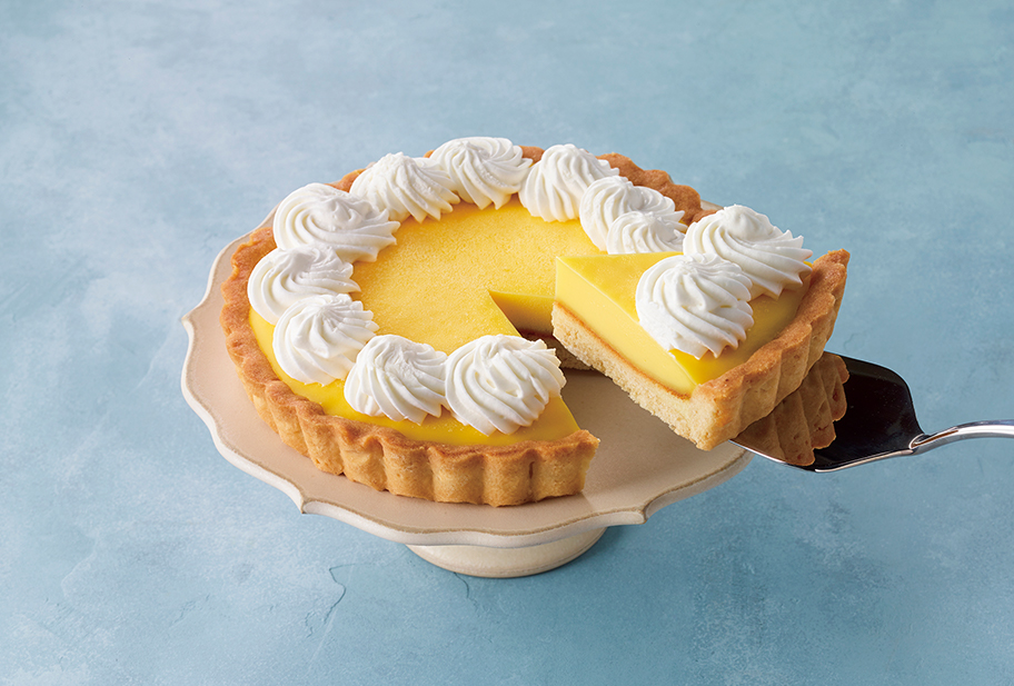 2025.10.21 フレック フリーカットレモンタルトホール320g箱 2025年冬商材特集 そのまま提供できるホールタイプ。カフェ・デザートメニューに最適な一品です。 サクサクに焼き上げた自家製タルト生地に、さわやかな酸味を感じるレモンクリームを合わせたレモンタルトです。ほんのり甘いクリームを天面に絞りました。