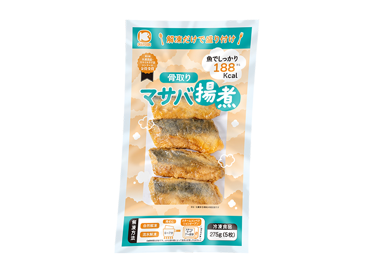 2025.10.27 オカフーズマサバ揚煮骨取り【55g×5】 2025冬・KOEI季節のオススメ① 骨取り済みで手間いらず!ふっくらやわらか、手軽に使える本格的な逸品です。 冷凍のまま加熱が可能!自然解凍でも美味しくお召し上がりいただけます。こだわりの調味料を使用し、白いご飯にぴったり。