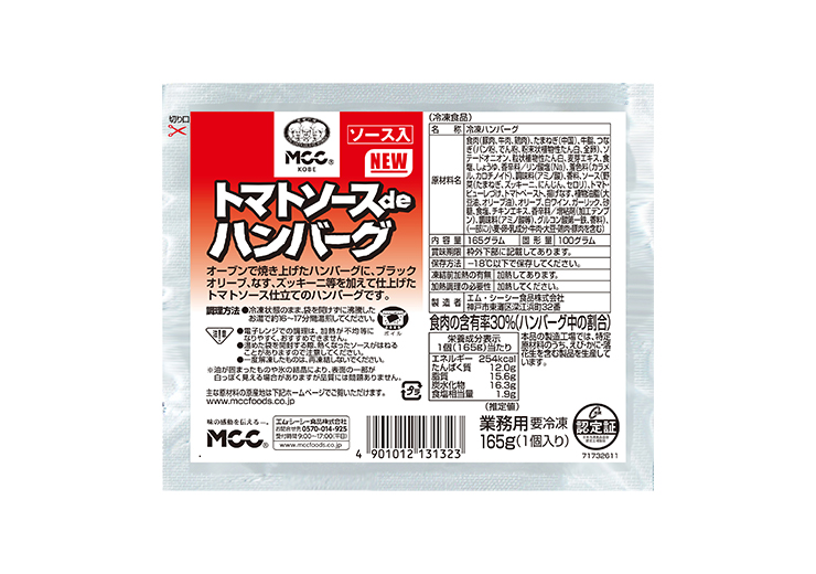 2025.12.01 6192トマトソースDEハンバーグ【165g×20】 MCC食品 25.12 彩り野菜で見栄え抜群!温めるだけで本格トマトソースハンバーグ。 オーブンで焼き上げたハンバーグに、ブラックオリーブ、なす、ズッキーニ等を加えて仕上げたトマトソース仕立てのハンバーグです。