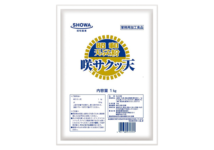 2025.12.01 1216昭和産業咲サクッ天ぷら粉1㎏袋 昭和産業 25.12 揚げ種の旨みを際立てる、サクッと軽い仕上がり。 時間が経ってもサクサク感が長続きします。揚げ種の旨みをより一層引き立てる塩味をプラスしました。
